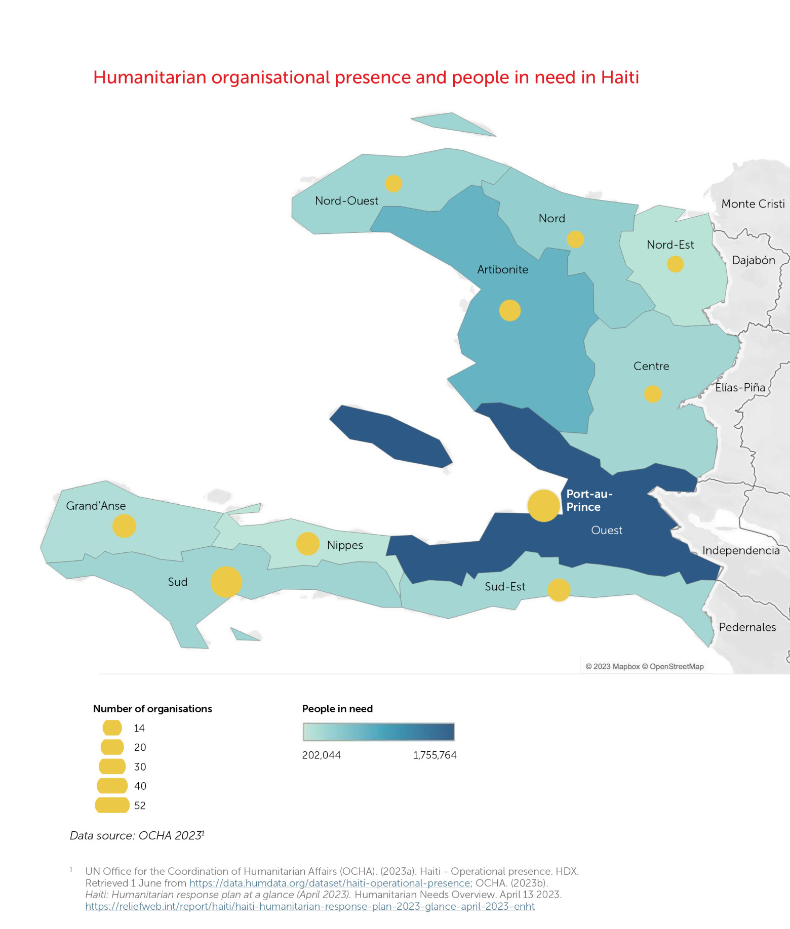 Haiti’s humanitarian crisis has resulted from a political and economic implosion, compounded by natural shocks, but with consequences similar to major armed conflicts – including severe constraints to humanitarian access. The collapse of law and order after the assassination of the president in 2021, and a wave of violence perpetrated by armed criminal gangs, has displaced over 100,000 people from their homes and contributed to the breakdown of basic social services. These developments contributed to a resurgence of cholera on the island, which to date has taken hundreds of lives, many of them children. Although over 100 humanitarian groups are present in Haiti, the threat of violence prevents them from responding in the places and at the level required to meet the needs.