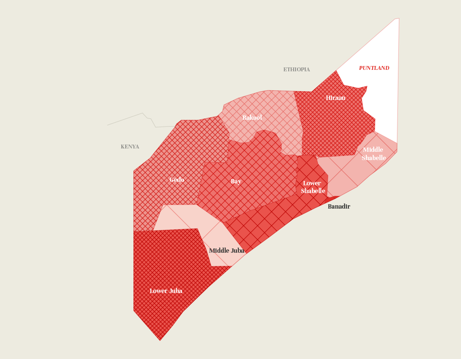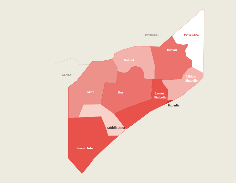 Humanitarian coverage is markedly lower in the Shabaab-controlled areas, particularly their stronghold, Middle Juba, and in Lower Shabelle. Aid organisations are discouraged from operating in these areas not only by the threat of violence, but also by the risk of running afoul of the counter-terrorist legal and financial regulations of donor governments.